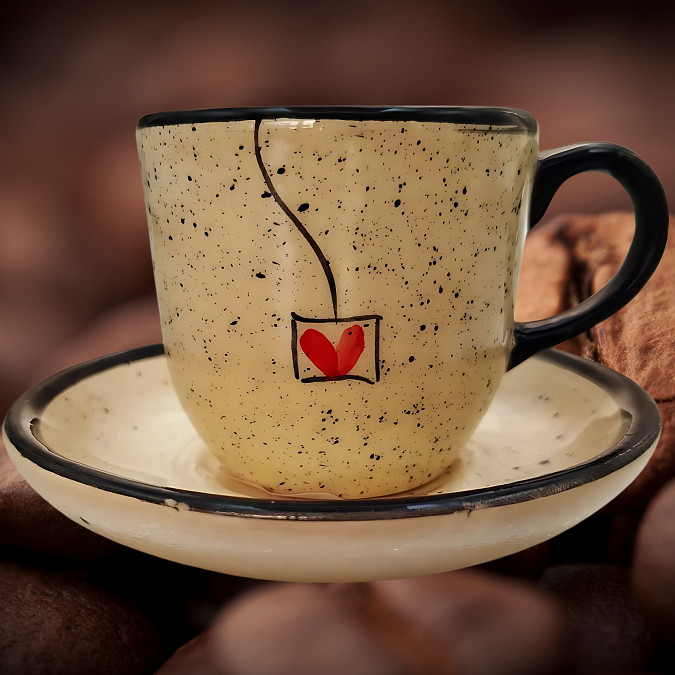 Este conjunto é composto por bule, xícaras de café e pires decorado com coração vermelho, é ideal para quem aprecia a beleza e a funcionalidade artesanal.